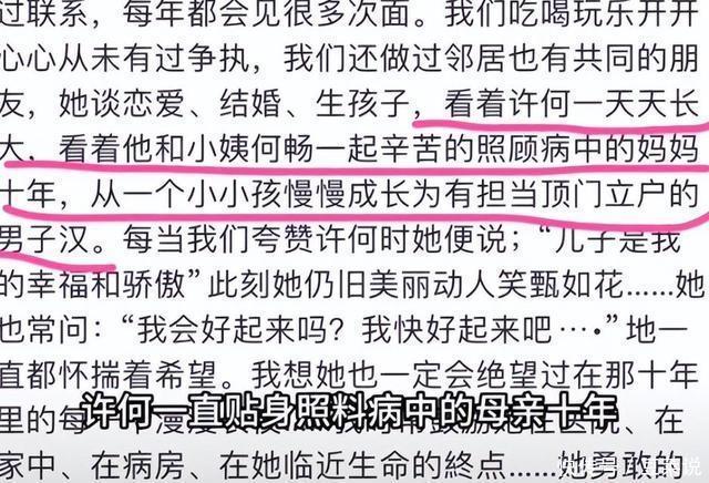 后来闺蜜发文悼念何晴的时候,曾提到过许何年少时的过往。 人们这才惊讶的发现,这对父子的关系似乎并不那么亲密。 在文中,闺蜜称赞许何是个好儿子,跟自己的小姨一起照顾了母亲十多年,14岁就从父亲家里搬过去了。